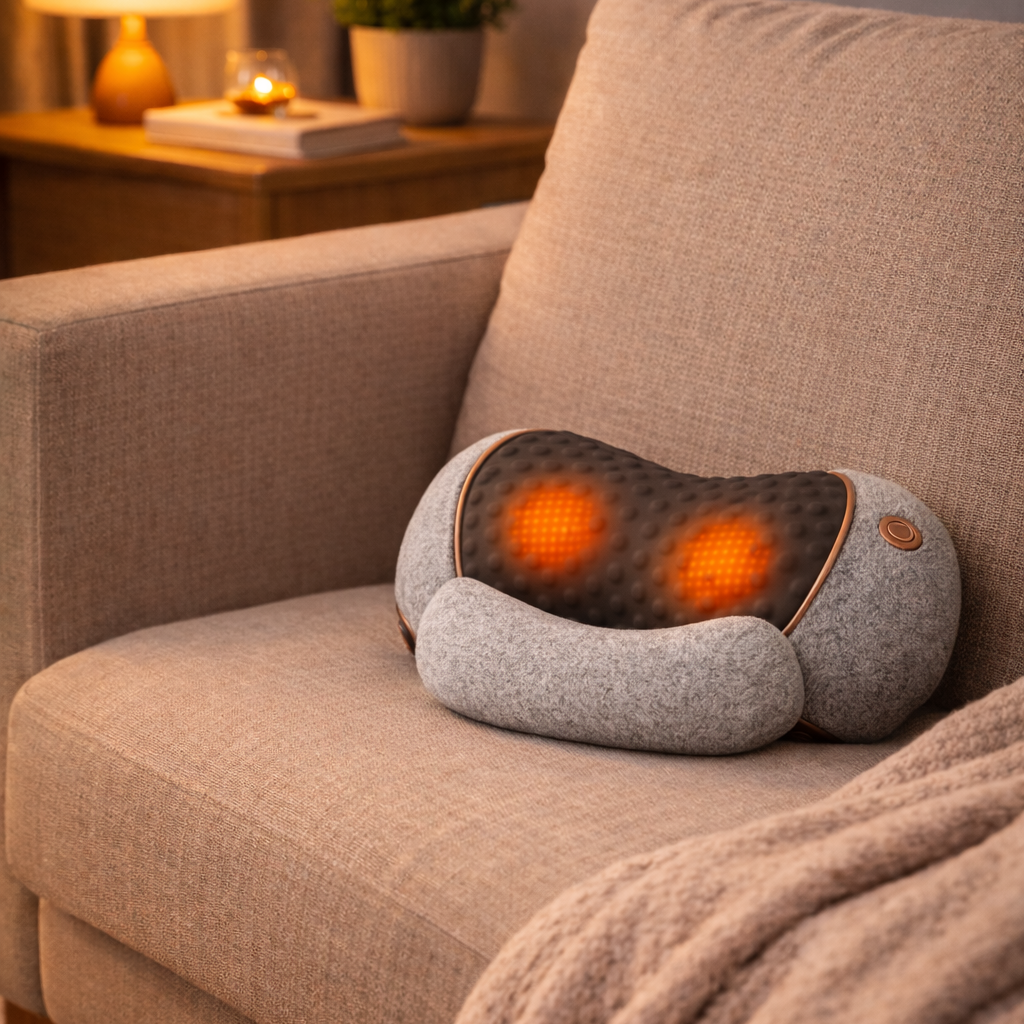 Placer sous la nuque ou le haut du dos, activer le massage et la chaleur, puis profiter d’un moment de détente.